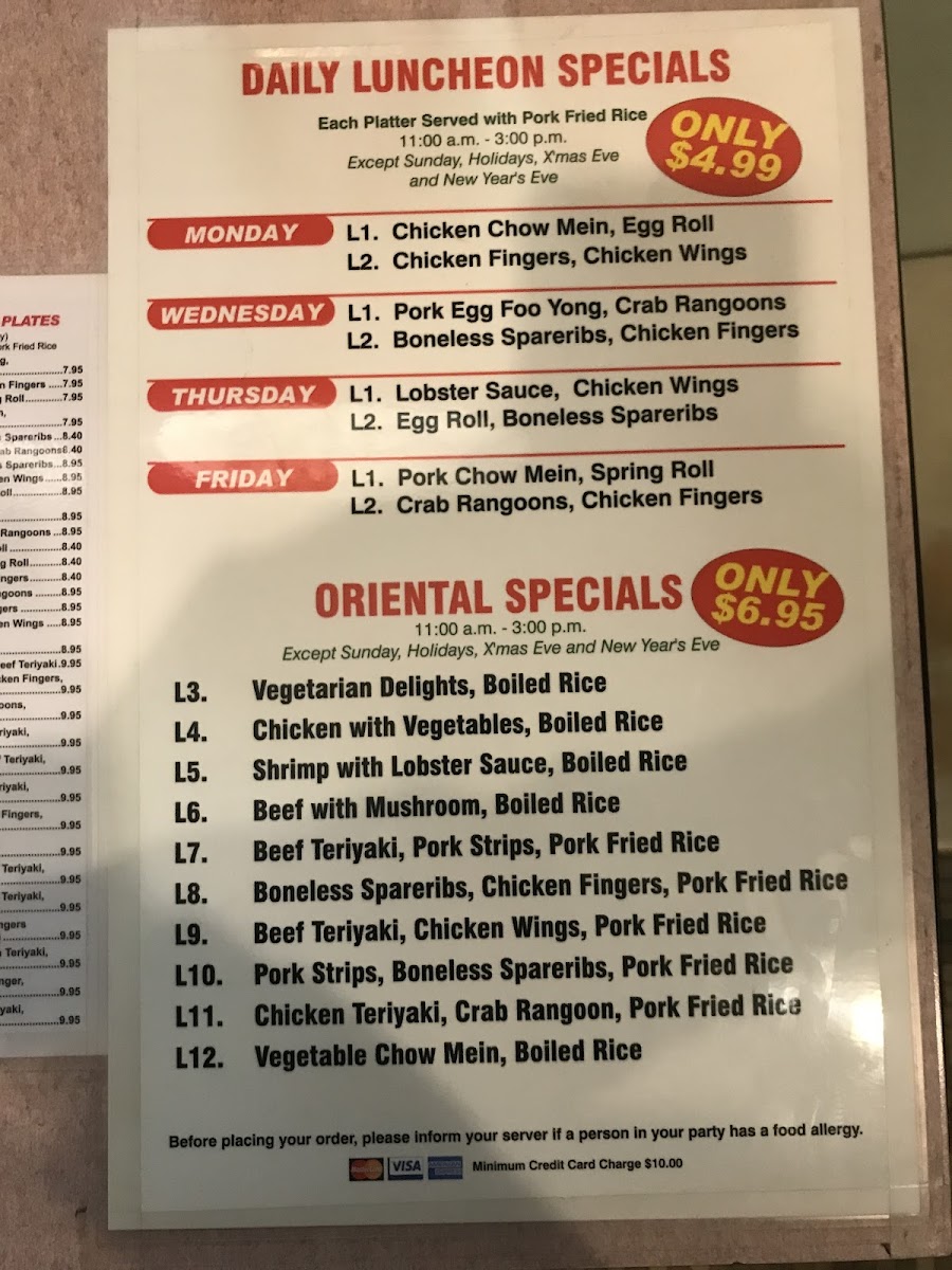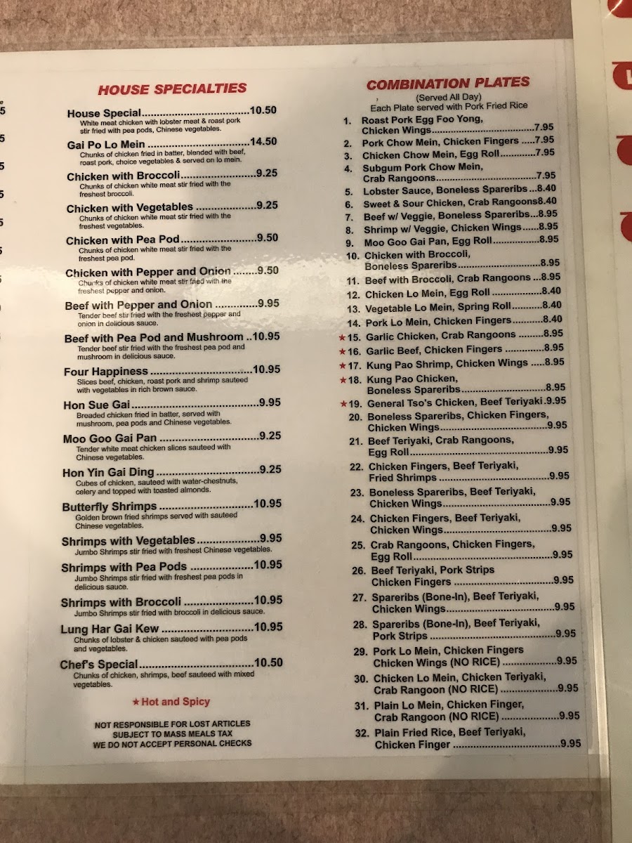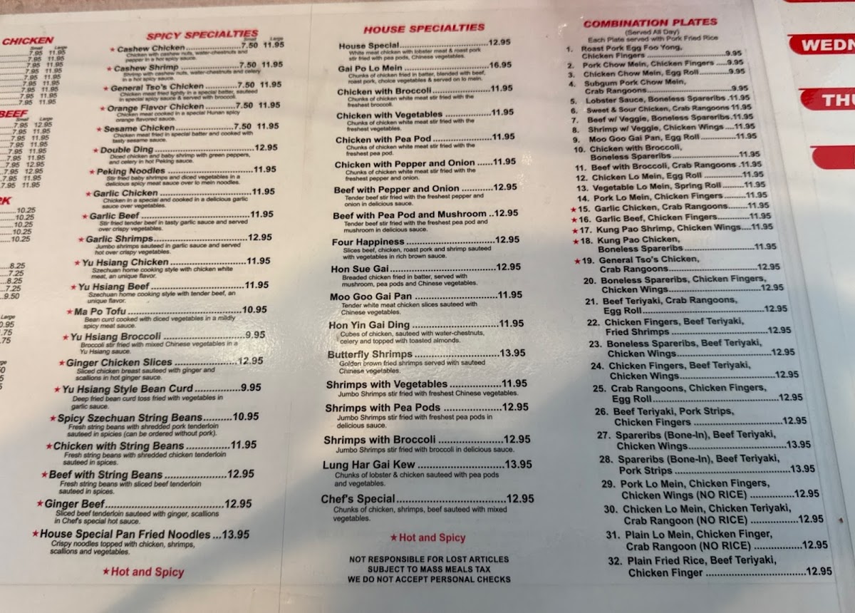 The menu includes a range of Egg Foo Young dinners, Oriental specialties featuring both spicy and mild choices, and traditional Moo Shu dishes, accommodating different tastes and preferences. The flavors complement the restaurant’s warm and unpretentious atmosphere, making it a reliable spot for everyday dining.